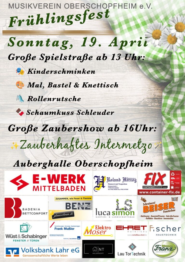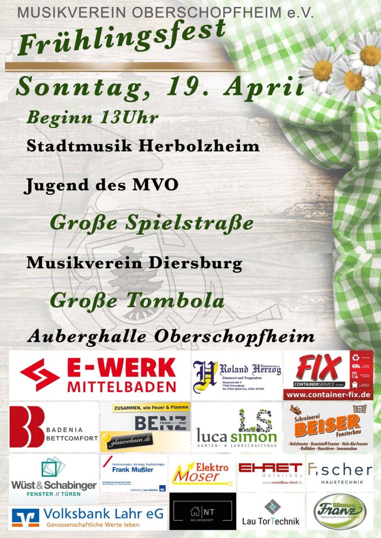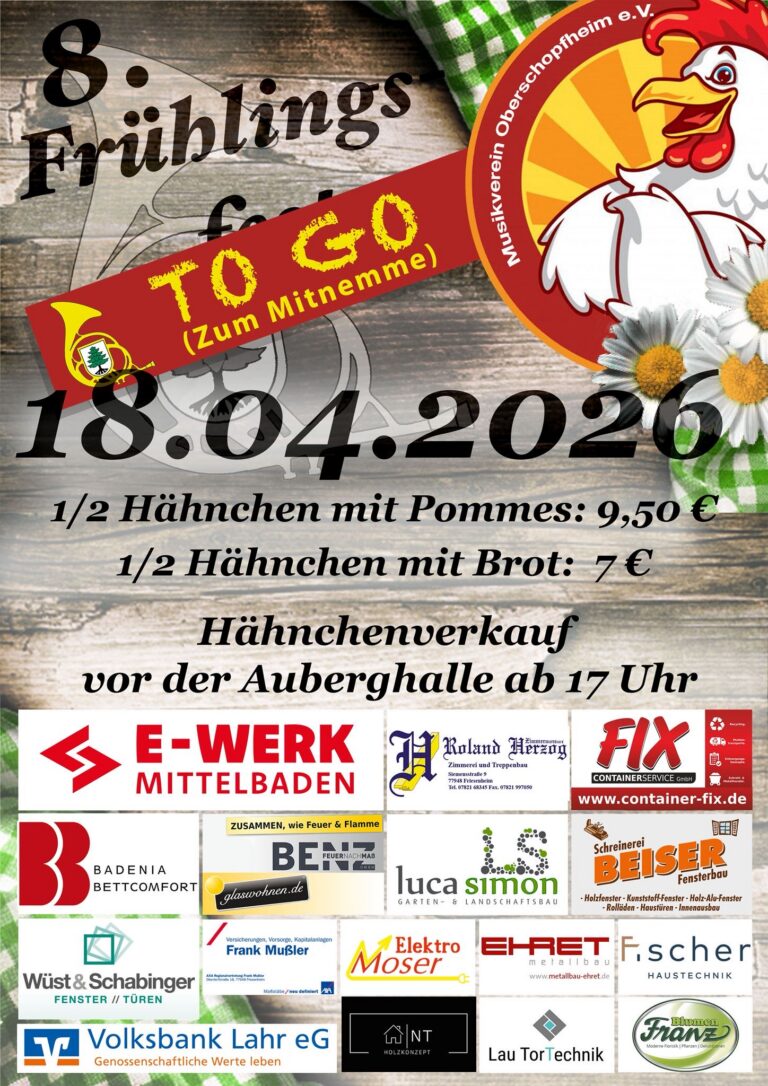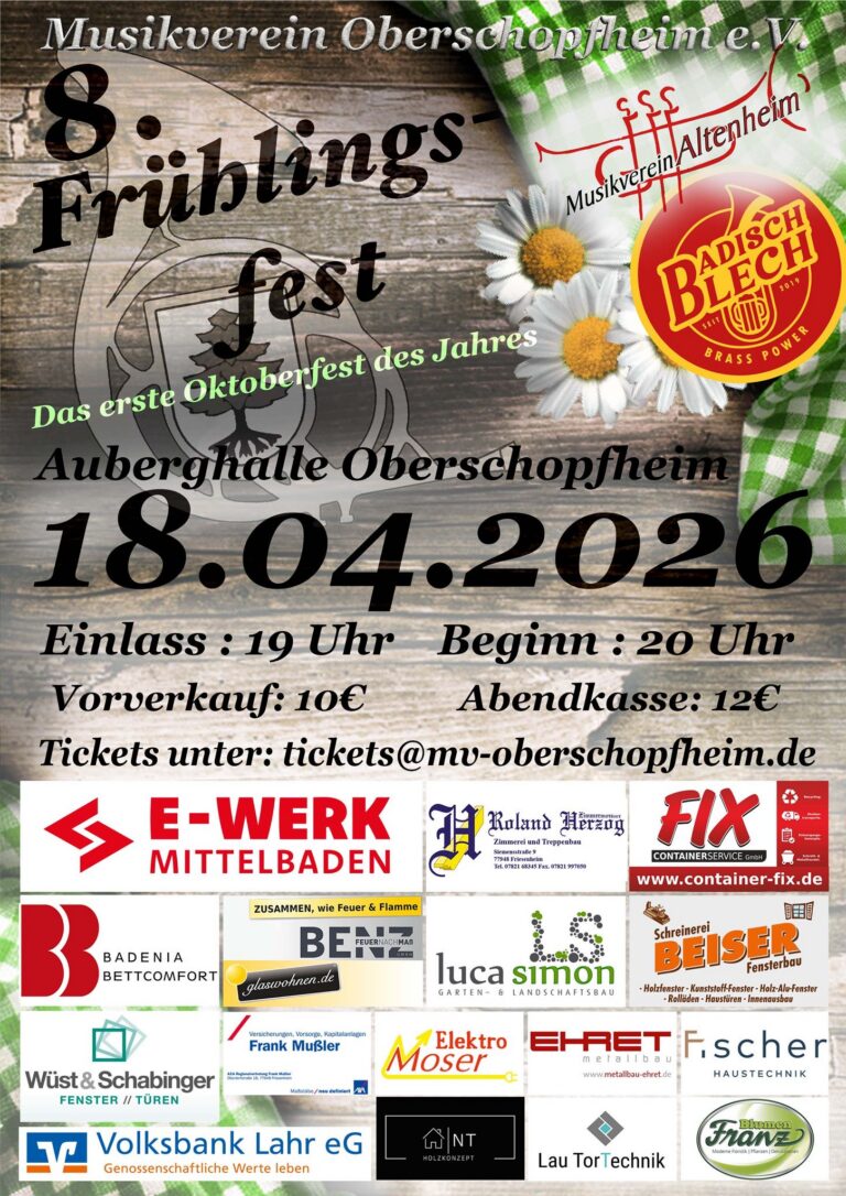 Am Samstag, den 09. Mai, fährt der Musikverein Oberschopfheim zum „Blasmusik Non-Stop“ im Rahmen des Schinkenfestes nach Triberg. Von 15:00 bis 19:00 Uhr spielen wir gemeinsam mit sechs weiteren Musikvereinen im Festzelt – die Kapellen wechseln sich dabei in kurzer Folge ab und sorgen so durchgehend für beste Unterhaltung.