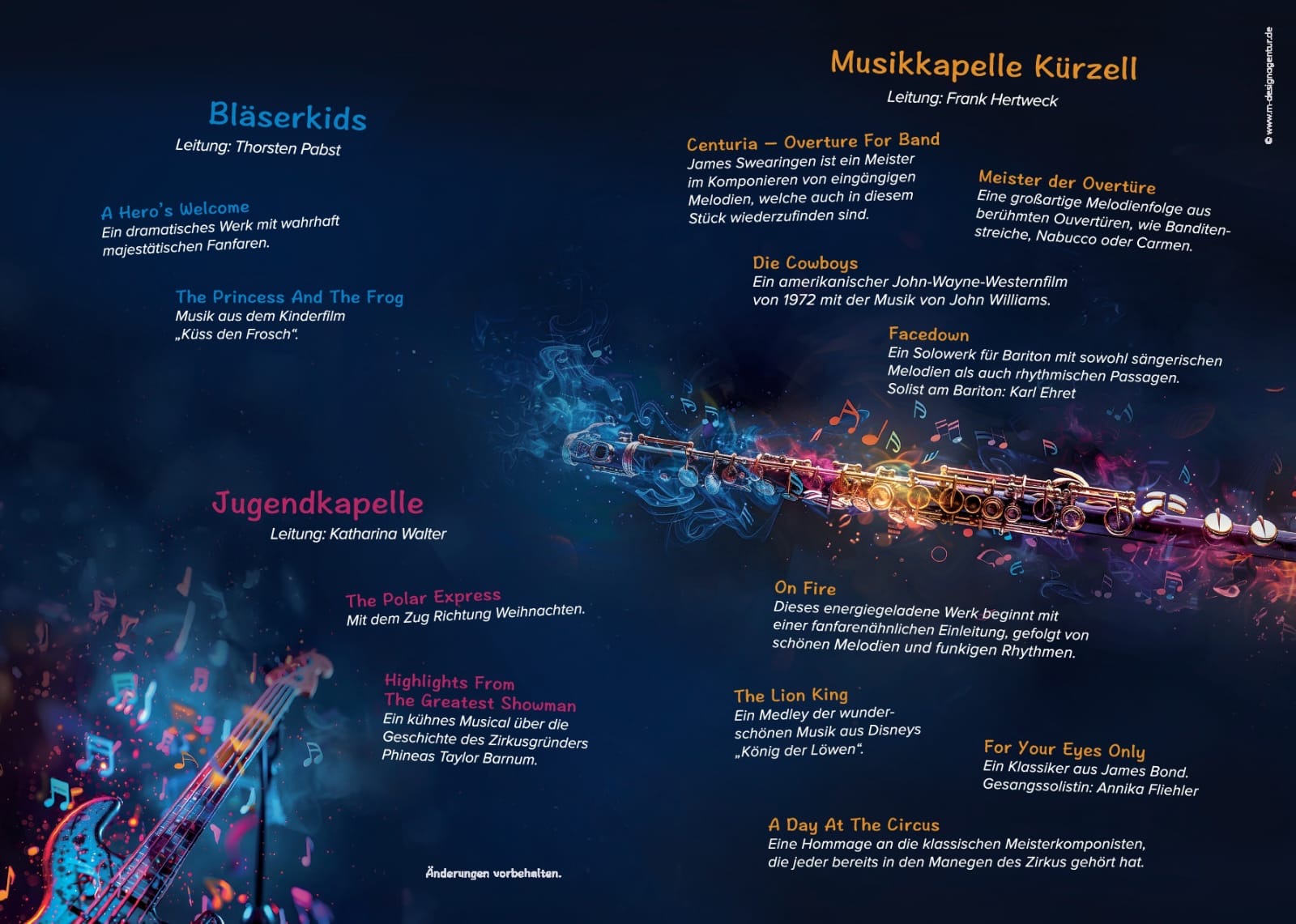 Wir laden Sie bereits heute herzlich ein, mit uns gemeinsam das neue Jahr musikalisch zu begrüßen. Am Samstag, den 3. Januar 2026 erwartet Sie ein ganz besonderer Abend unter dem Motto „Farbenspiel der Musik“. Freuen Sie sich auf einen unterhaltsamen und abwechslungsreichen Konzertabend: Wir reisen zusammen durch die musikalische Farbpalette — von Filmmusik (u. a. aus „Frozen“) über mitreißende Klänge aus „Moulin Rouge“, von Michael Jackson mit „Black or White“, bis hin zum schwungvollen Titel „Regenbogenfarben“.